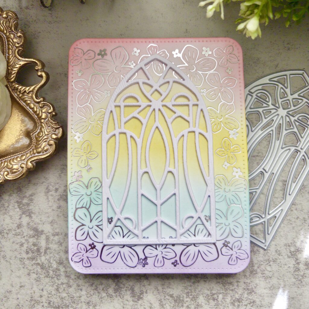 Kelly shares, “One last Easter card before the big day arrives! This card pays homage to Easter with a beautiful cathedral window, silver foiling, and spring flowers bursting everywhere! I brought in a mix of old and new for this one-of-a-kind Easter greeting. This card is sure to bring the true spirit of Easter to the recipient!”