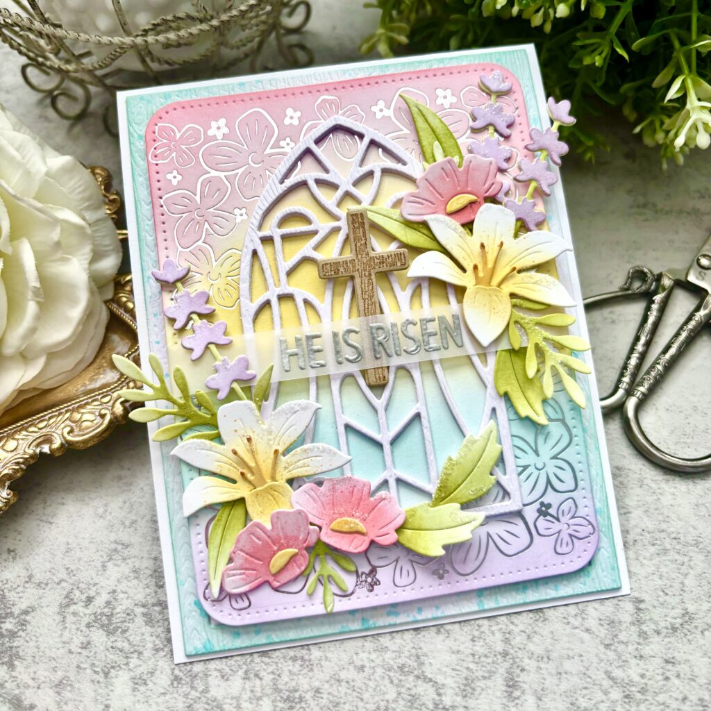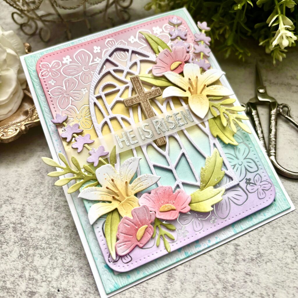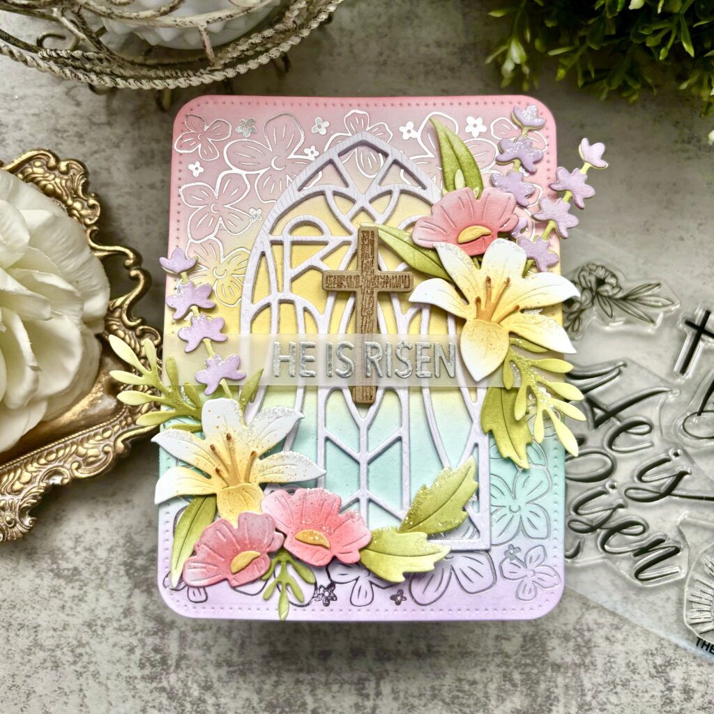 Kelly Lunceford captures the beauty and meaning of Easter with this stunning He Is Risen card, featuring a layered stained glass window surrounded by soft spring florals and delicate silver accents. 🌸✨ Using the Stained Glass Windows dies paired with the Framed in Flowers hot foiled background, she creates a luminous focal point that draws the eye straight to the cross and embossed sentiment. The blend of pastel inks, dimensional layers, and intricate die cutting gives this design a graceful, uplifting feel that perfectly reflects the spirit of the season.