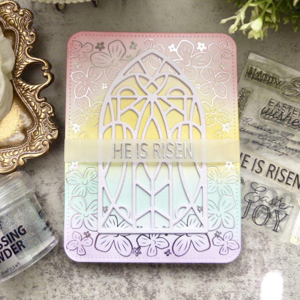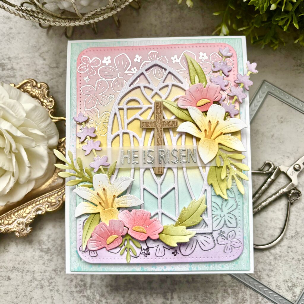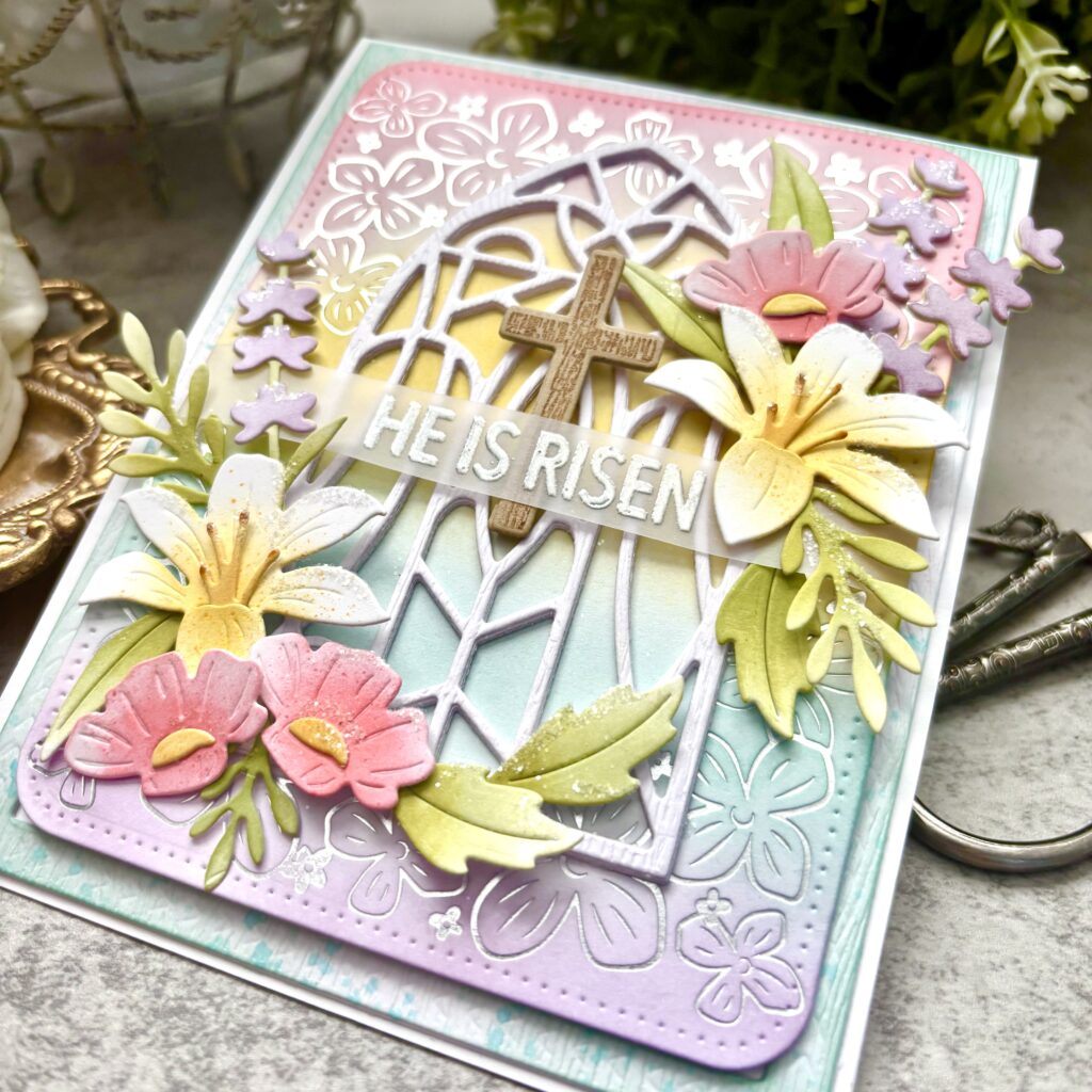 Kelly Lunceford captures the beauty and meaning of Easter with this stunning He Is Risen card, featuring a layered stained glass window surrounded by soft spring florals and delicate silver accents. 🌸✨ Using the Stained Glass Windows dies paired with the Framed in Flowers hot foiled background, she creates a luminous focal point that draws the eye straight to the cross and embossed sentiment. The blend of pastel inks, dimensional layers, and intricate die cutting gives this design a graceful, uplifting feel that perfectly reflects the spirit of the season.