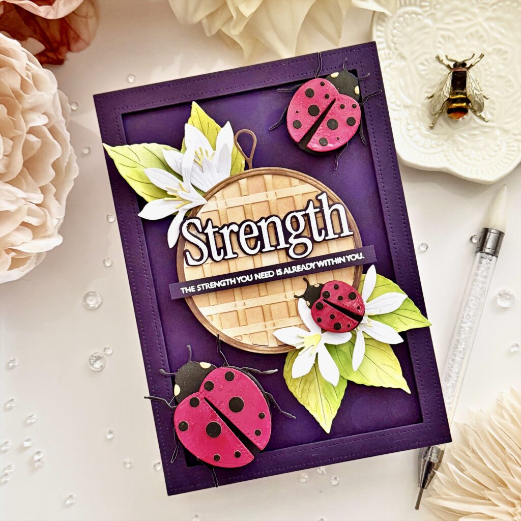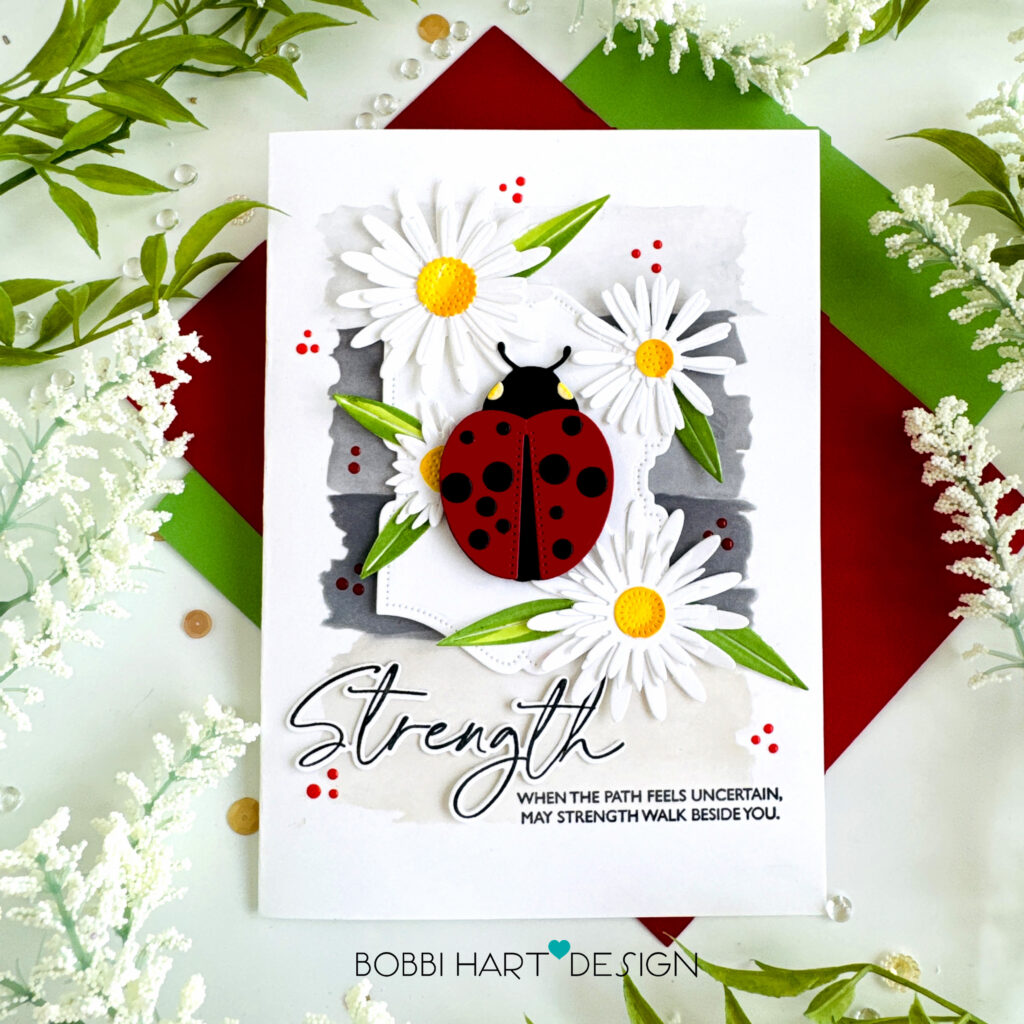- Create dimension by using foam adhesive to pop your ladybug and wreath up off the card base.