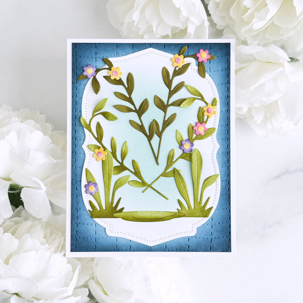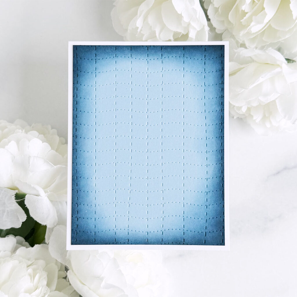 Step 1: Die-cut a panel of Spring Rain cardstock with the Handmade Quilt Cover Plate Die. Trim the panel slighlty, then ink the outside edges with Blueberry Sky and Dark Indigo inks using blending brushes. Adhere to A2 white card base.