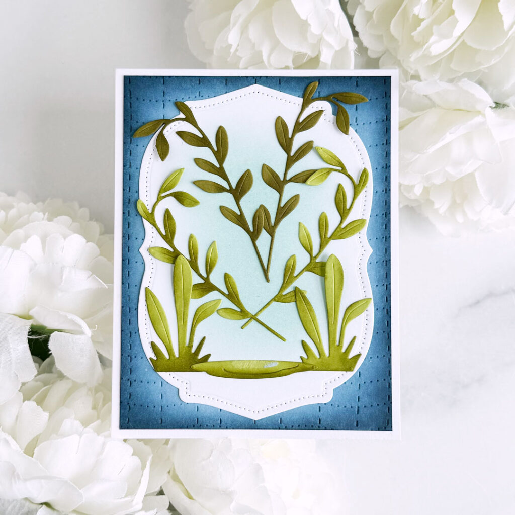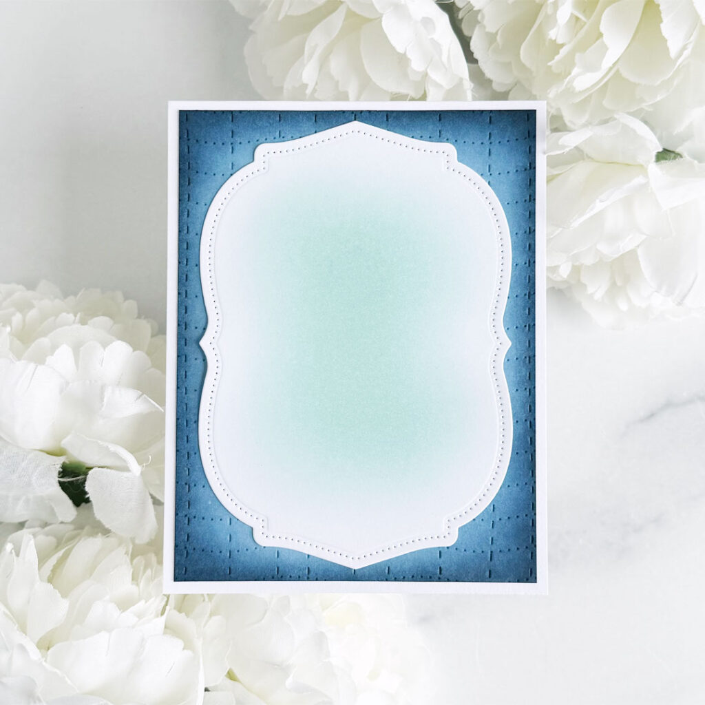 Step 2: Die-cut the largest die in the Reflections: 1 Corinthians 6 Die Set from Stamper’s Select White cardstock. Blend Aqua Mist ink onto the center with a blending brush, then adhere to the background.