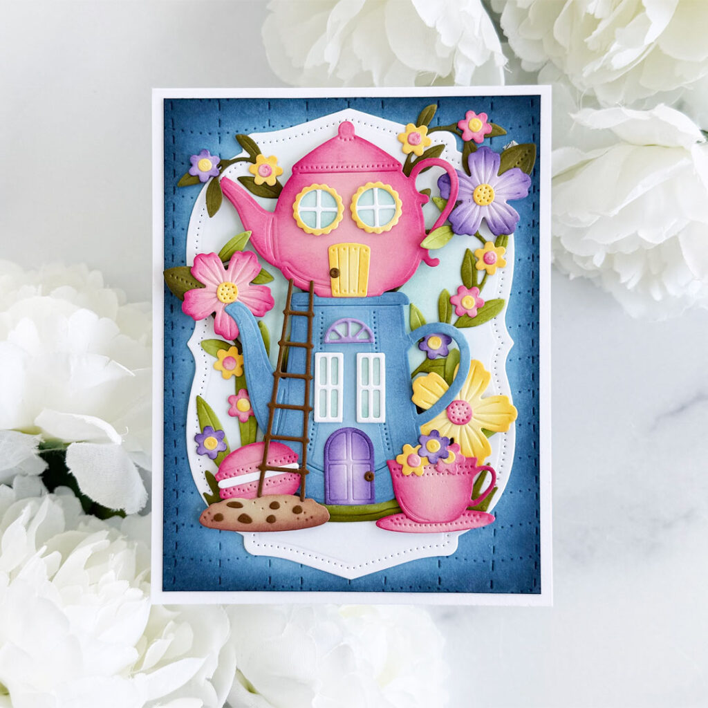 Step 5: Die-cut all the elements for the teapots, ladder, teacup, sweet treats and large flowers from Pale Peony, Spring Rain, Lemon Tart, Lilac Grace, Fine Linen, Cocoa Bean and Stamper’s Select White cardstock using the Build-A-Teapot Dies. Add ink with Hibiscus Burst, Raspberry Fizz, Summer Sunrise, Royal Velvet, Blueberry Sky, Aqua Mist and brown ink. Adhere each element together with liquid glue, then pop them up onto the background with foam squares.