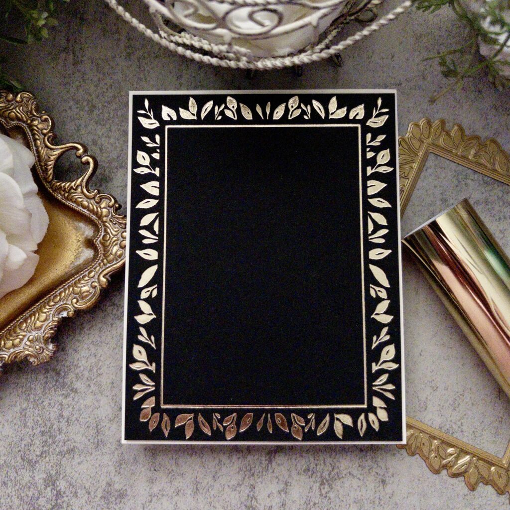 STEP 1: Foil the gold design on an A2 sized panel of True Black cardstock. Trim it down and attach it to an A2 Vintage Cream card base using foam squares.
