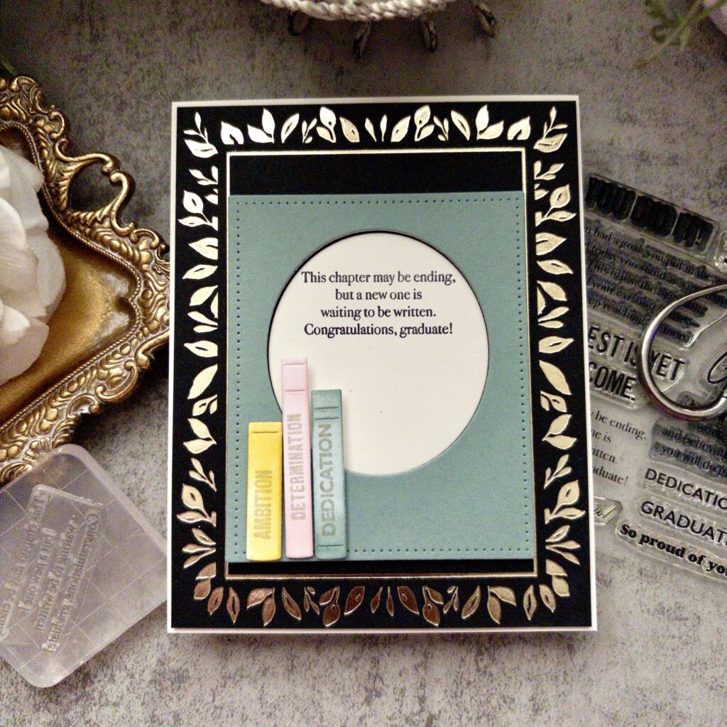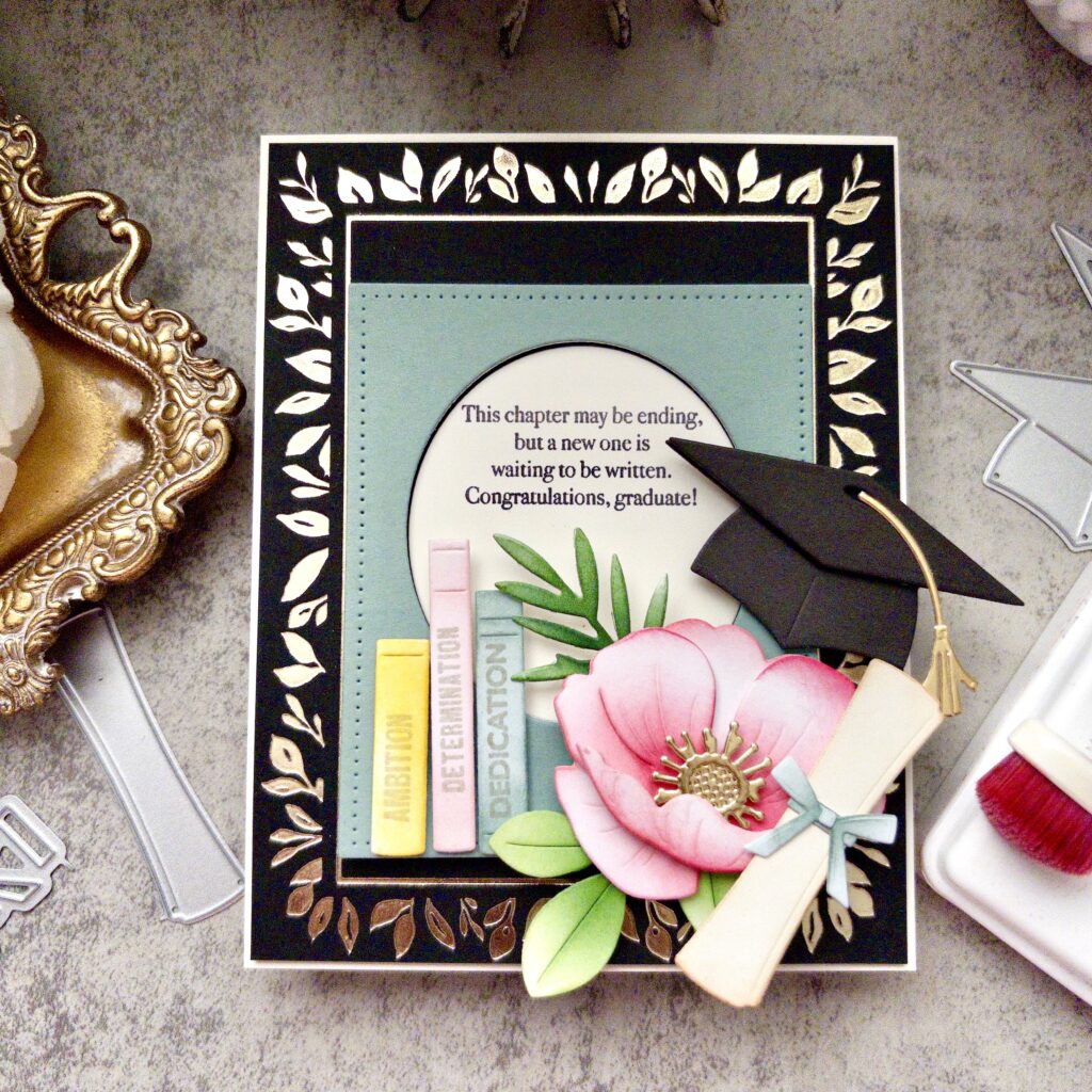 Kelly Lunceford marks a meaningful milestone with this elegant graduation card, combining scholarly details, soft florals, and shimmering accents in a design full of celebration and heart. 🎓✨ Framed with the foiled Fresh Greens Hot Foil Plate and layered with elements from the Framed in Success dies, the composition draws together stacked books, a graduation cap, diploma scroll, and a beautifully ink blended anemone for a focal point rich with symbolism.