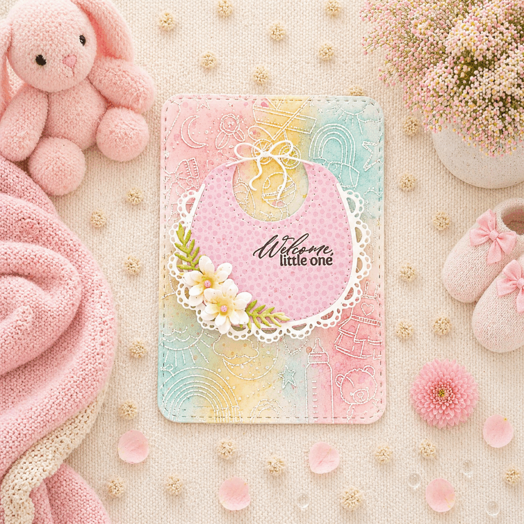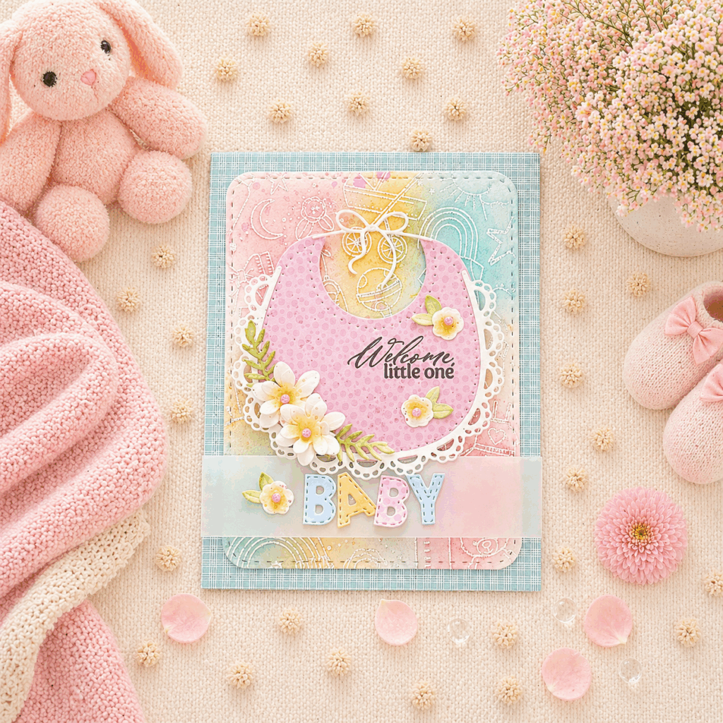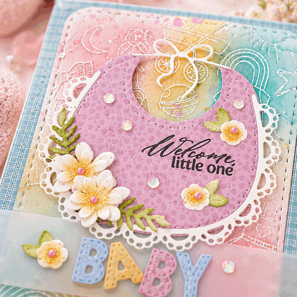 Melissa Phillips celebrates one of life’s sweetest blessings with this soft and charming baby card, layered with thoughtful details and a dreamy pastel palette. 🍼✨ Using the Sweet Baby Bib dies as the focal point, she pairs delicate florals, vellum accents, and playful BABY lettering with an embossed resist background created from the Baby Background stamp for a design full of warmth and whimsy. From the stitched rounded rectangle and layered bib to the subtle shimmer of sequins and glitter, each element works together to create a keepsake worthy card for welcoming a little one.