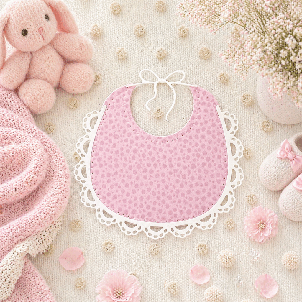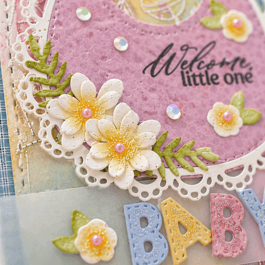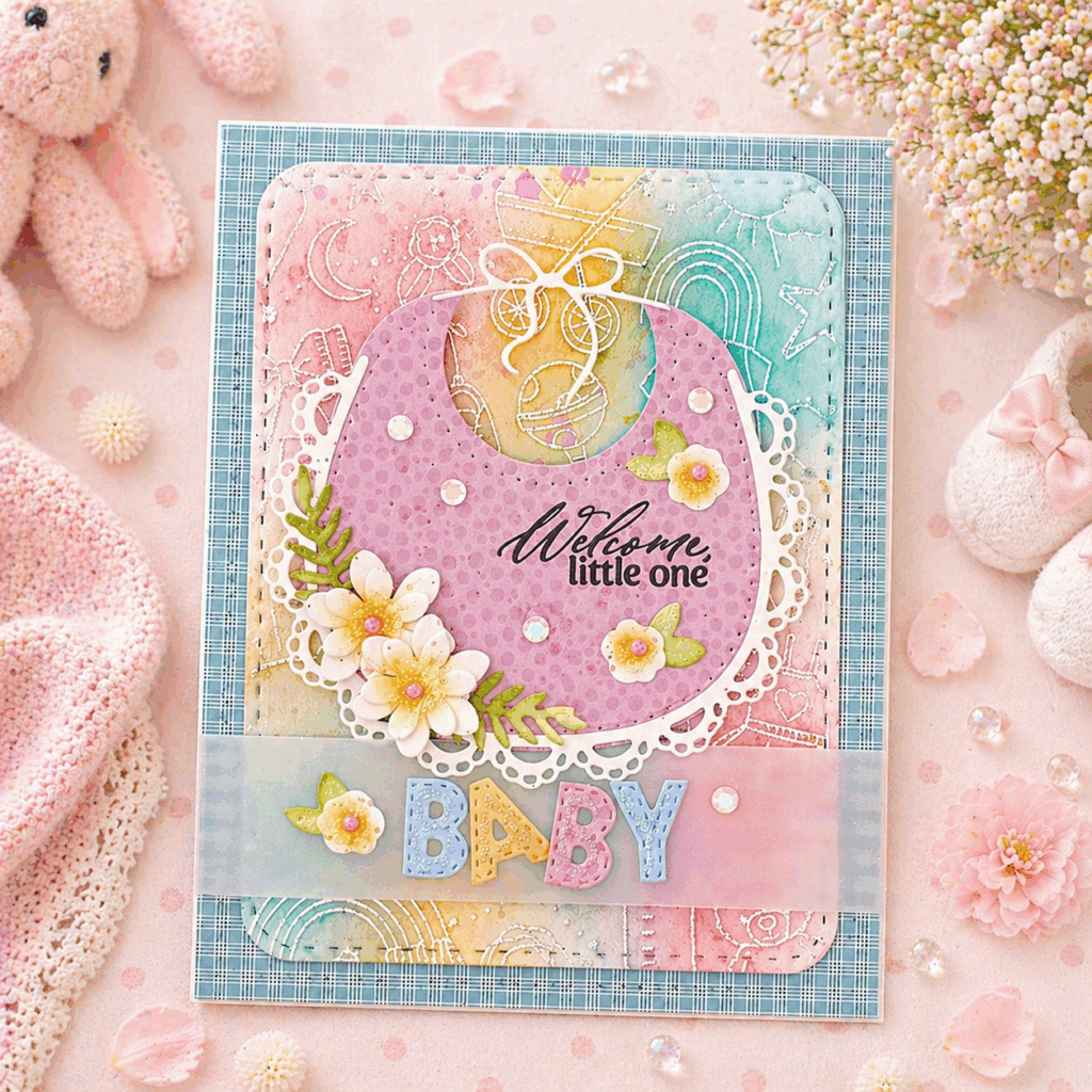 Melissa Phillips celebrates one of life’s sweetest blessings with this soft and charming baby card, layered with thoughtful details and a dreamy pastel palette. 🍼✨ Using the Sweet Baby Bib dies as the focal point, she pairs delicate florals, vellum accents, and playful BABY lettering with an embossed resist background created from the Baby Background stamp for a design full of warmth and whimsy. From the stitched rounded rectangle and layered bib to the subtle shimmer of sequins and glitter, each element works together to create a keepsake worthy card for welcoming a little one.