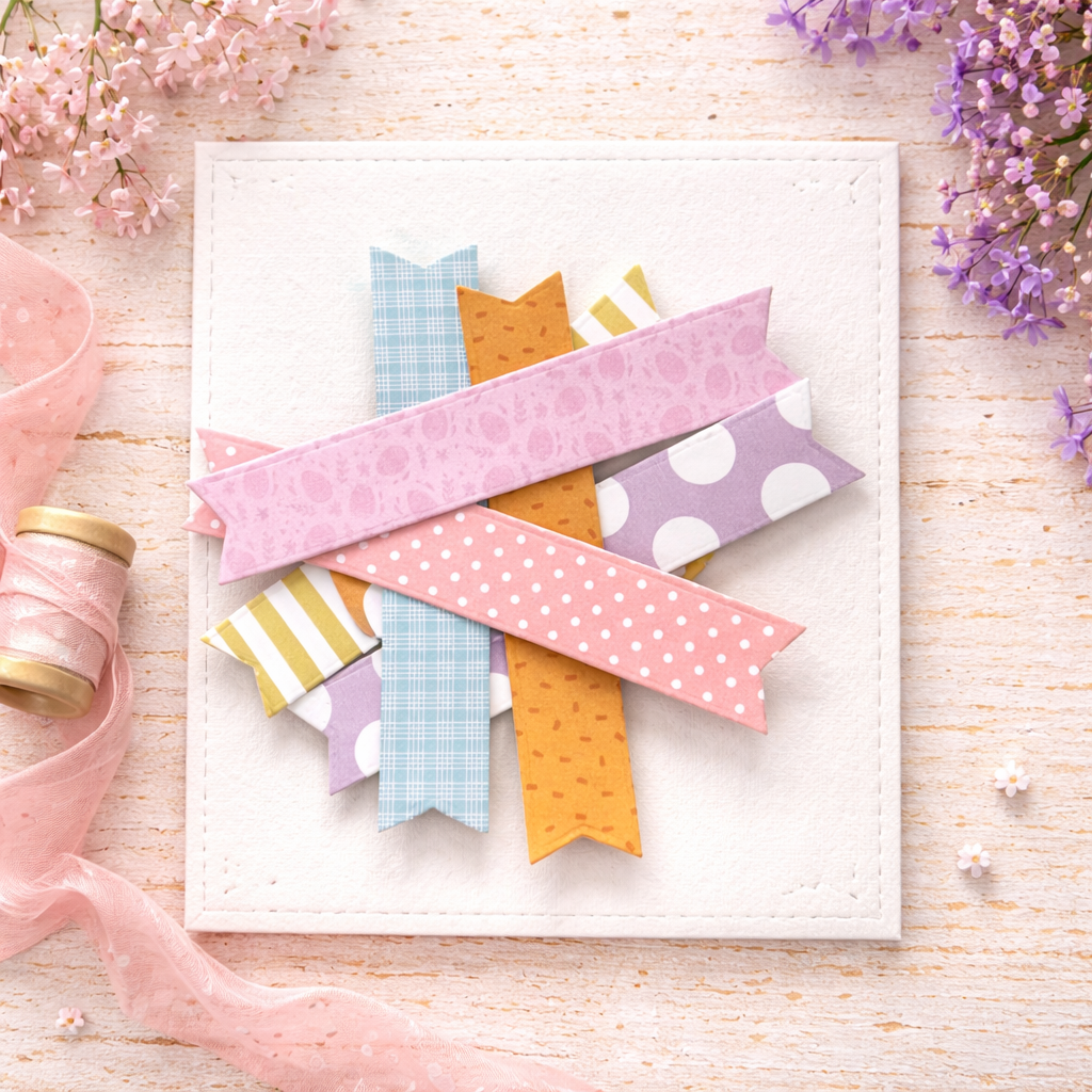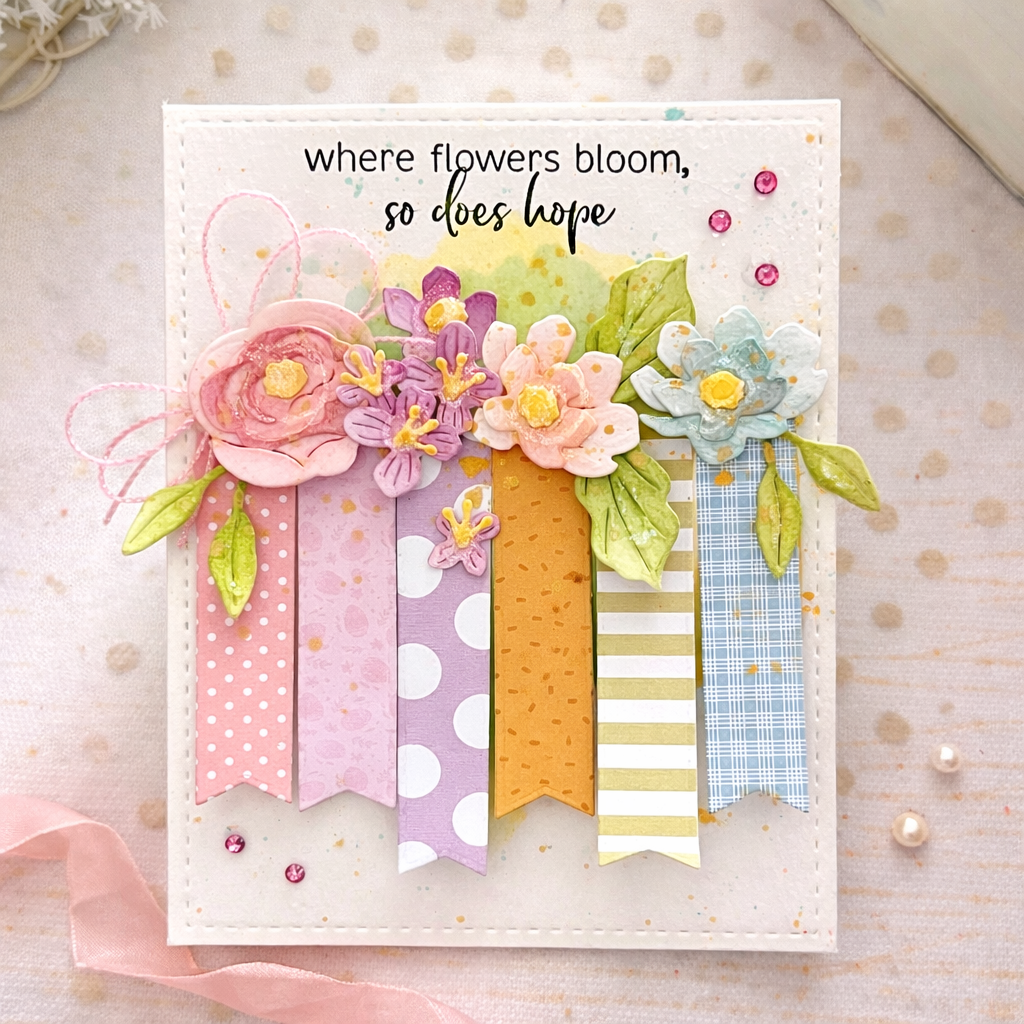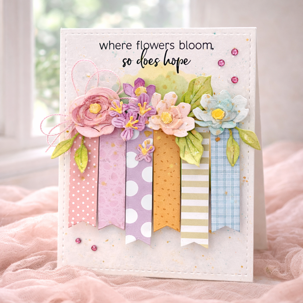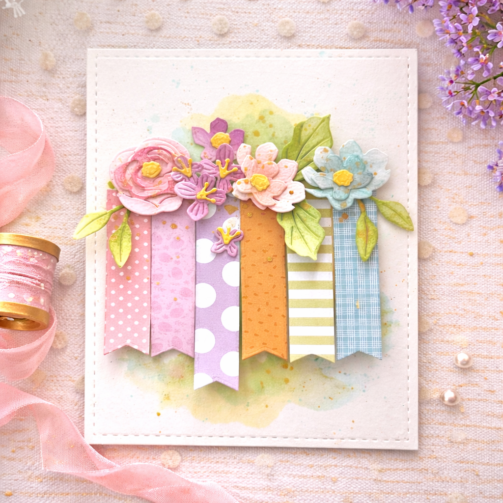 This card takes a different route, letting patterned paper lead the design instead of just supporting it. Melissa Phillips arranges colorful banner strips across the card front, creating a playful base that feels both structured and organic at the same time. The soft stenciled background adds just enough movement, while the Build-A-Bouquet florals bring everything together in a natural, effortless way. It’s a thoughtful mix of color, layering, and texture without feeling overworked.