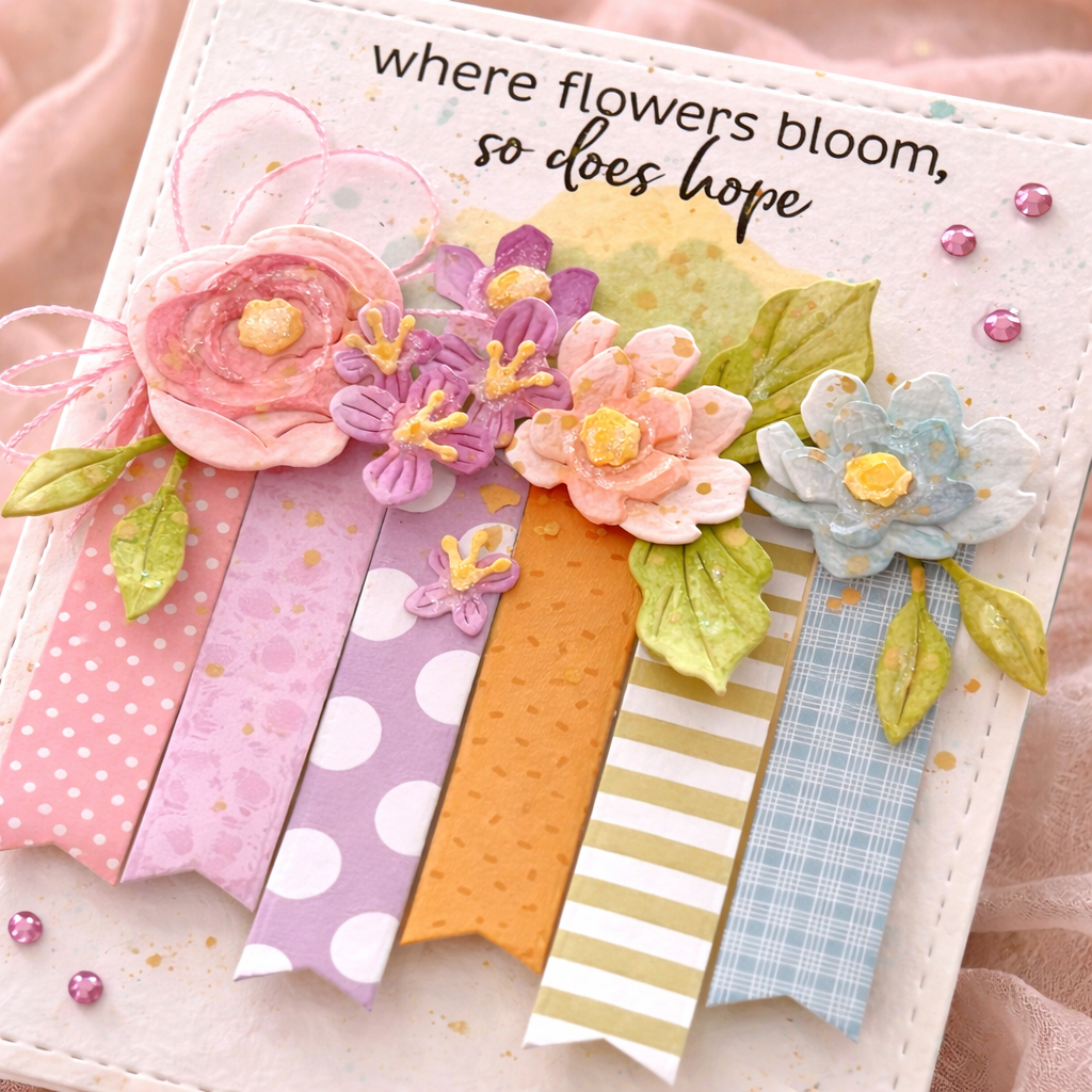 STEP 4: Adhere strips of paper unevenly just above the center of your card. Die cut and add color to your flowers and leaves. Add them across the tops of your strips.
