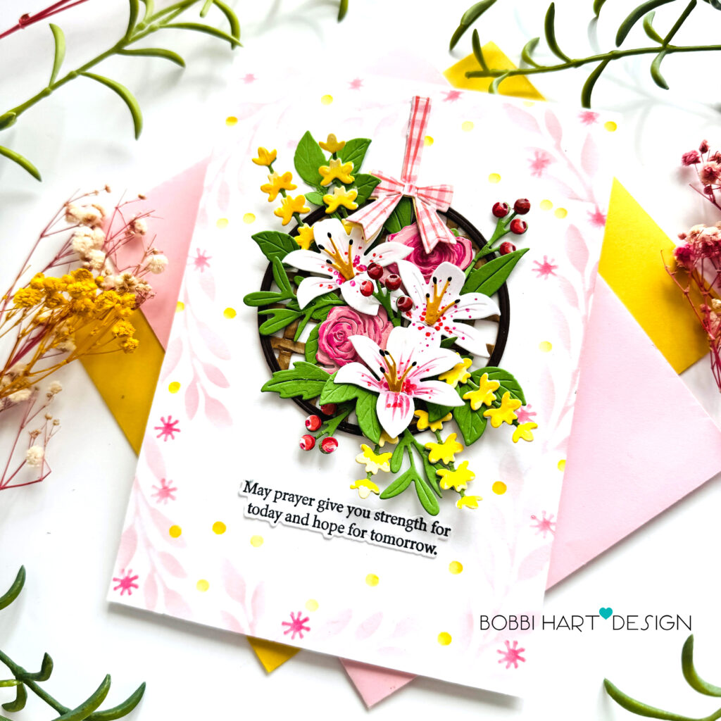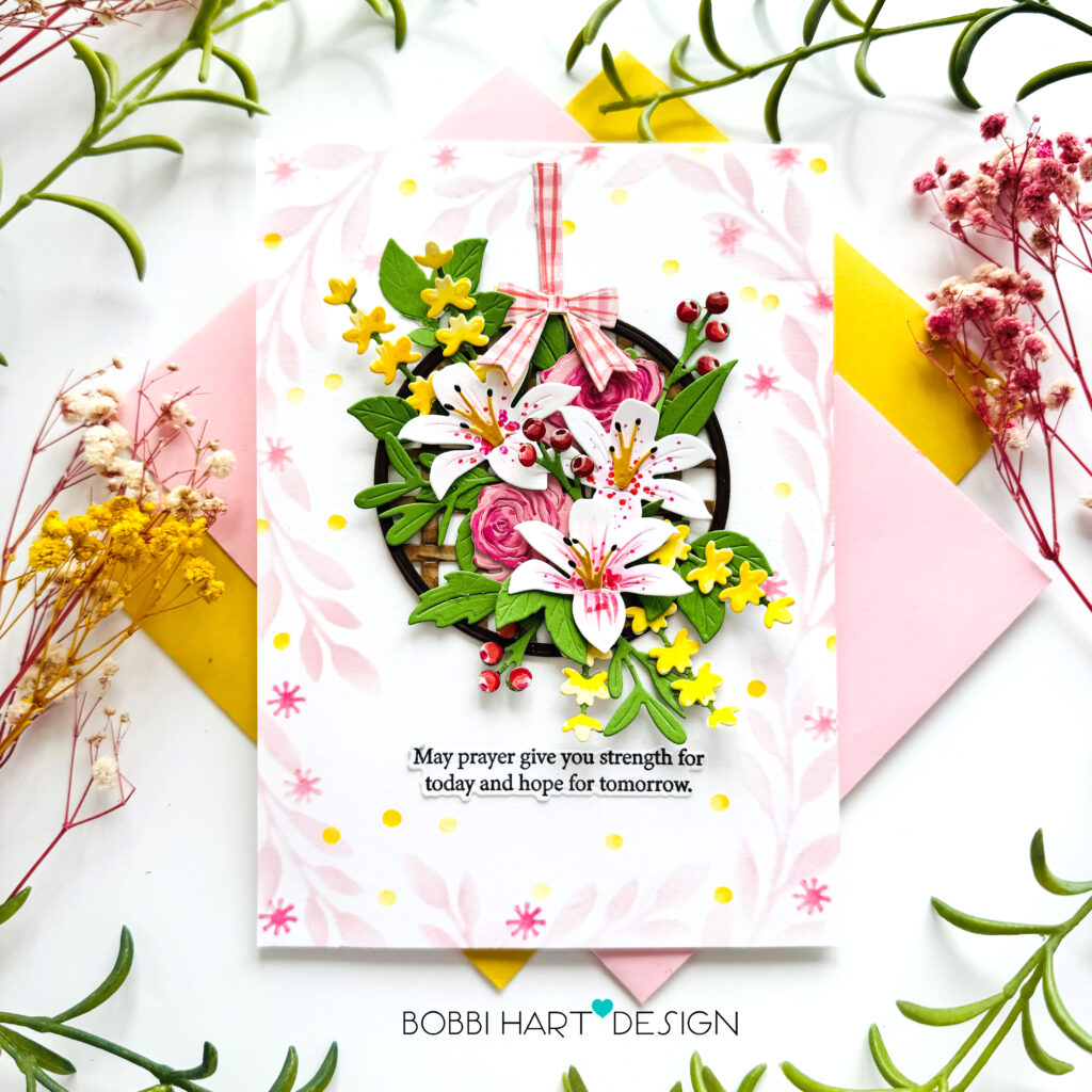 STEP SIX: Stamp, die cut and attach the sentiment using the Praying For You Sentiments II stamps and coordinating dies. Attach additional greenery as needed to fill in.