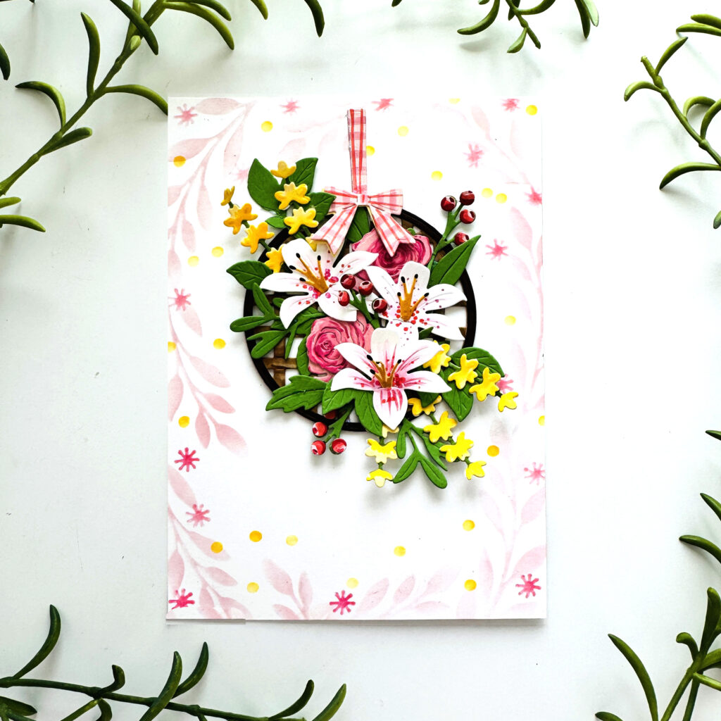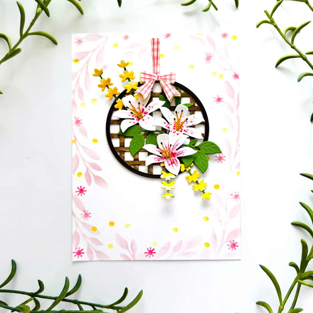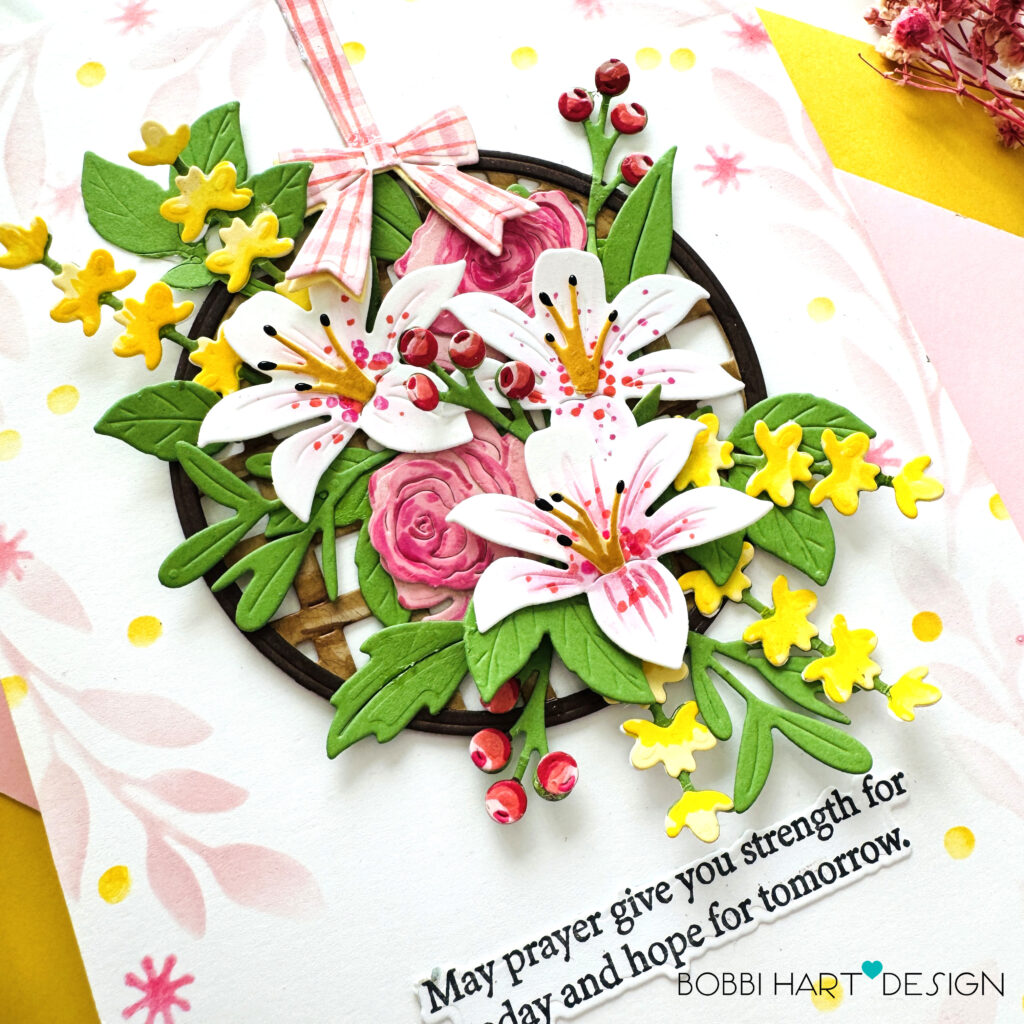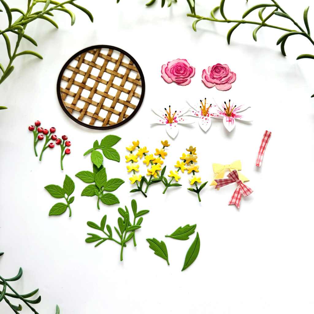 STEP TWO: Using the Into the Blooms: Spring Basket Dies, die cut leaves, florals and the wicker basket out of New Leaf, Harvest Gold, Lemon Tart, Sweet Blush, Stamper’s Select White, Classic Kraft, and Dark Chocolate. Add pink stripes in two colors in both directions to the pink bow for a gingham-like pattern. Assemble the flowers and use Copic markers or similar markers to add detailing to the flowers including the bold lily centers. Add highlights to the berries.