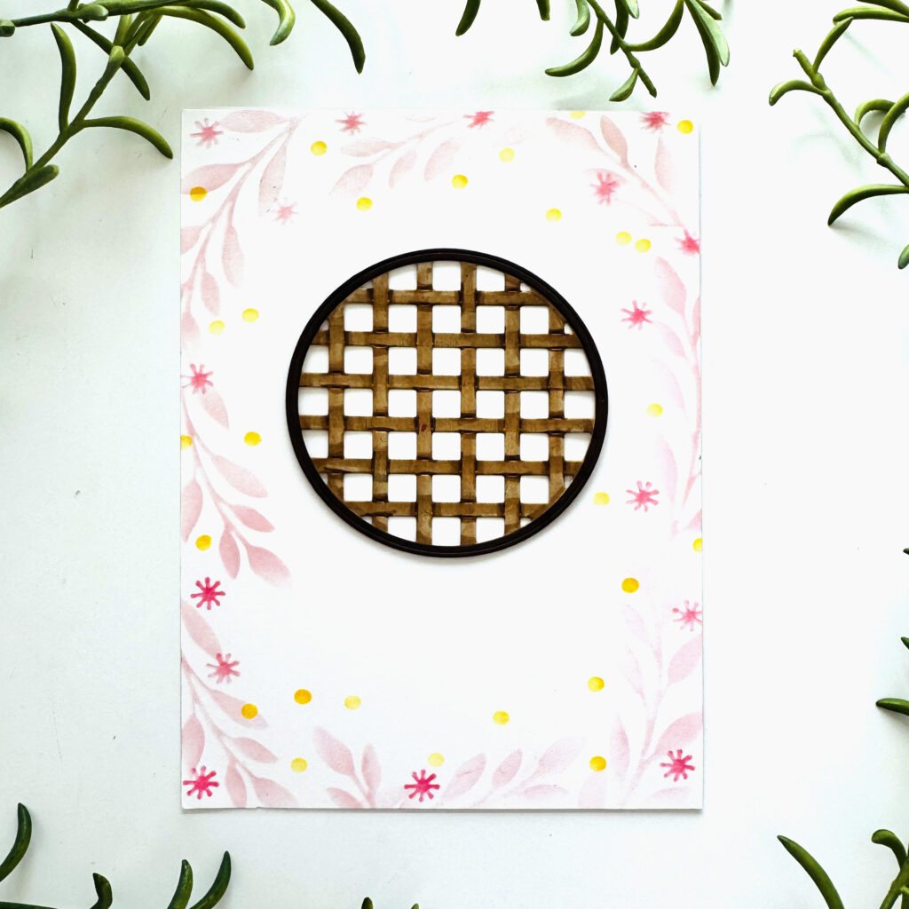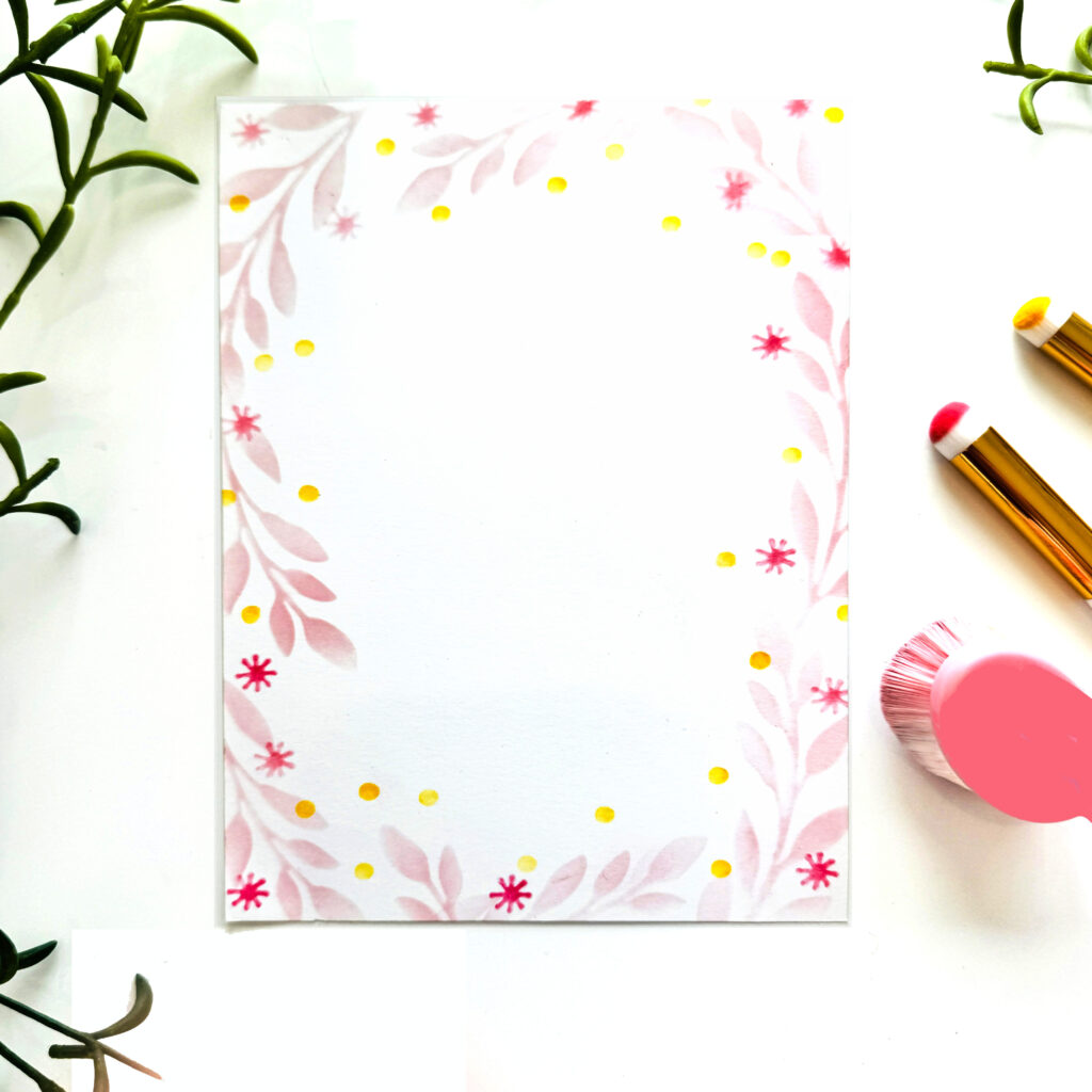 STEP ONE: Cut a 5″ X 7″ piece of white cardstock and stencil leaves and florals around the edges to create a border. Used Ranger Distress Oxide Ink in Spun Sugar, Mustard Seed and Picked Raspberry for the leaves, dots and florals, respectively.