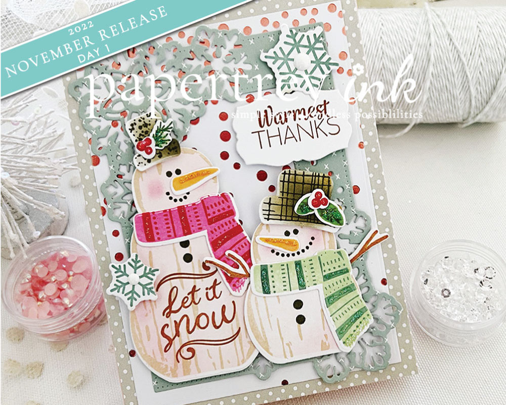 Simply Snowmen + Snowflake Fun Frame + Cascading Dots Hot Foil Plate + Simple Trees + Larger Than Life: Snow + Larger Than Life: Snow Sentiments + Playful Dots + Snowflake Banners